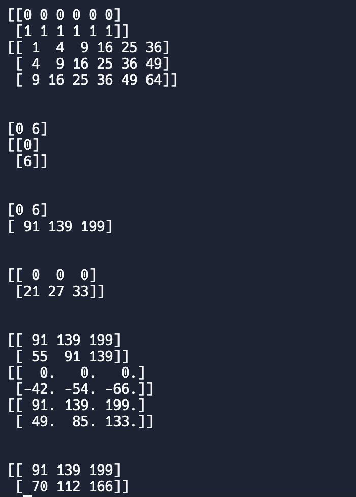 | (X[i] - self.X_train) ** 2 : (5000, 3072) | (arr1 - arr2) ** 2 : (3, 6) |