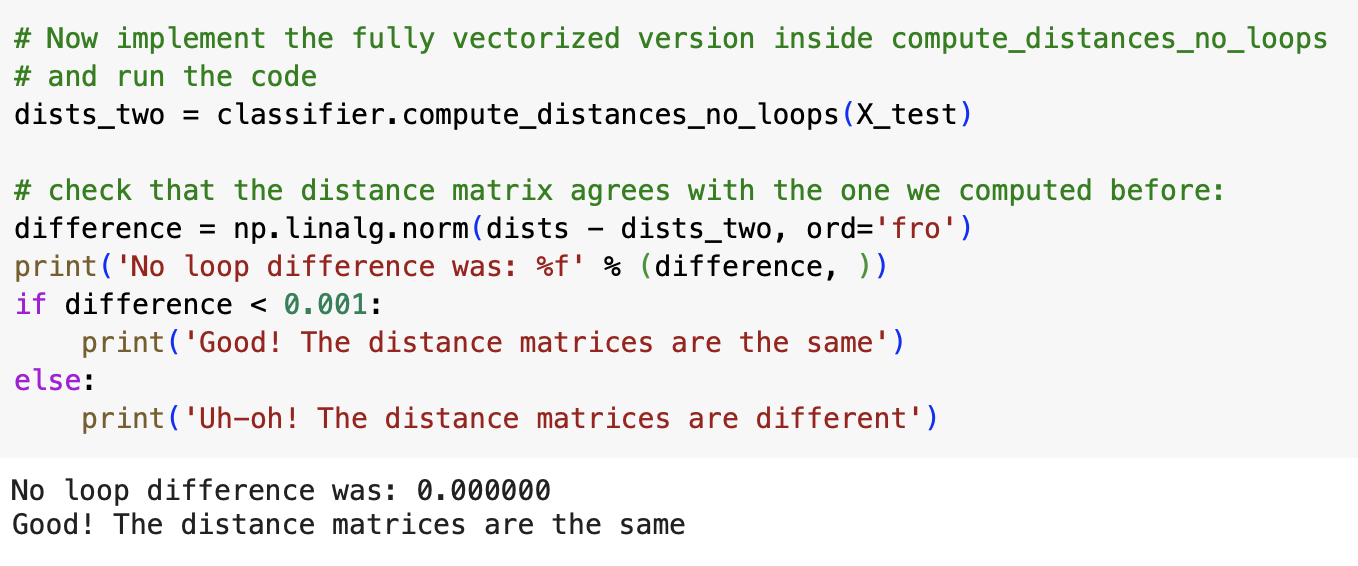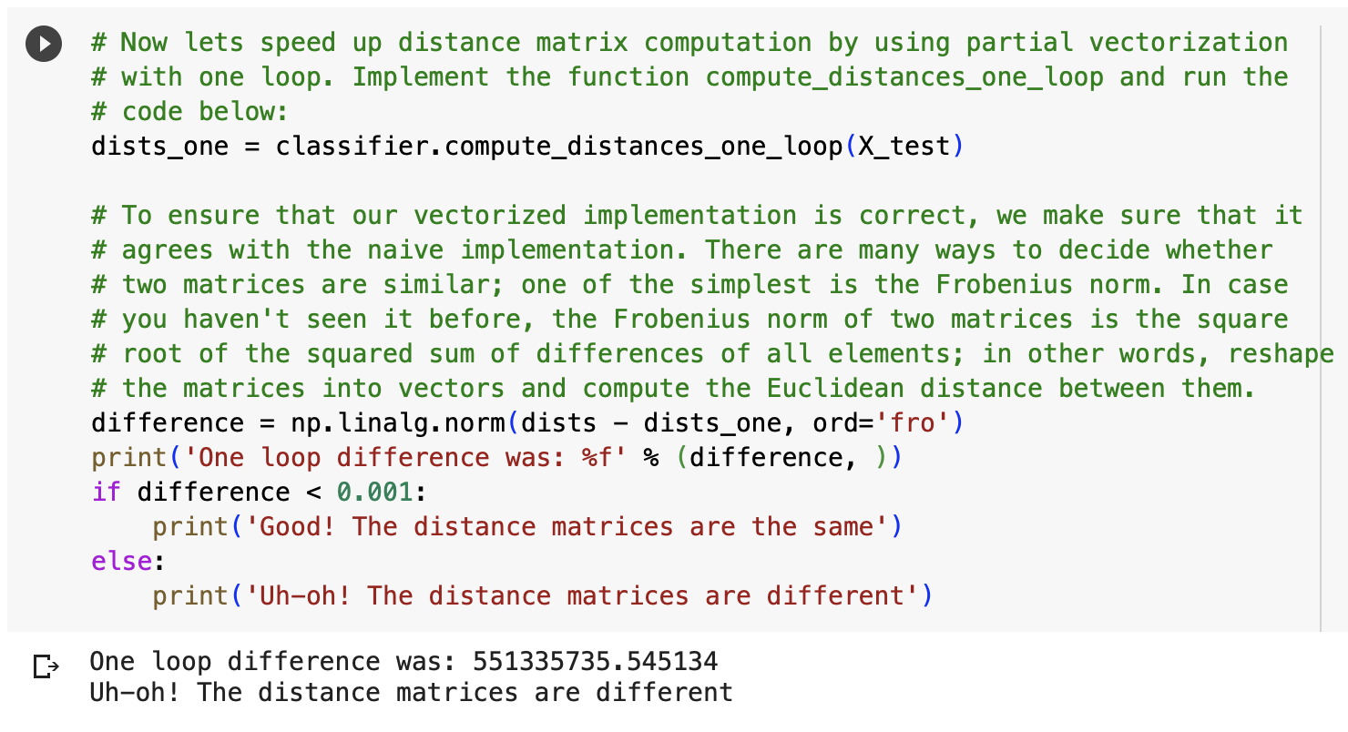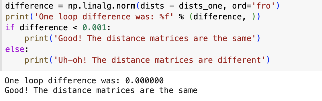 The main problem with using no loops is that the arrays didn't broadcast when it wasn't (1,3072) + (5000, 3072). So we needed to use matrix multiplication and broadcast sums to make a distance matrix.