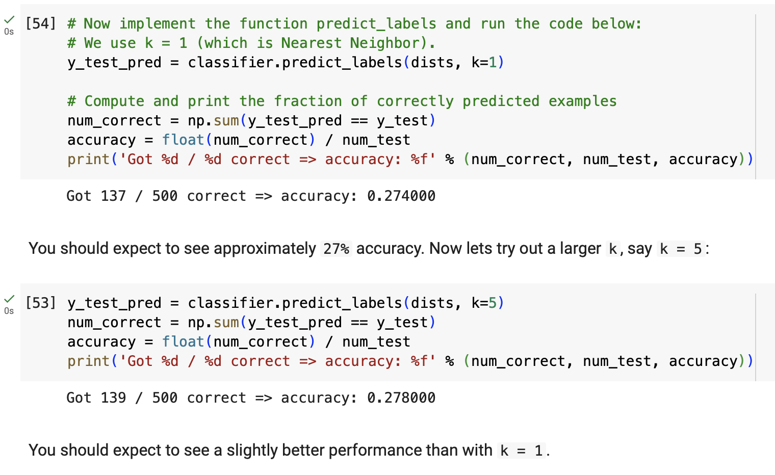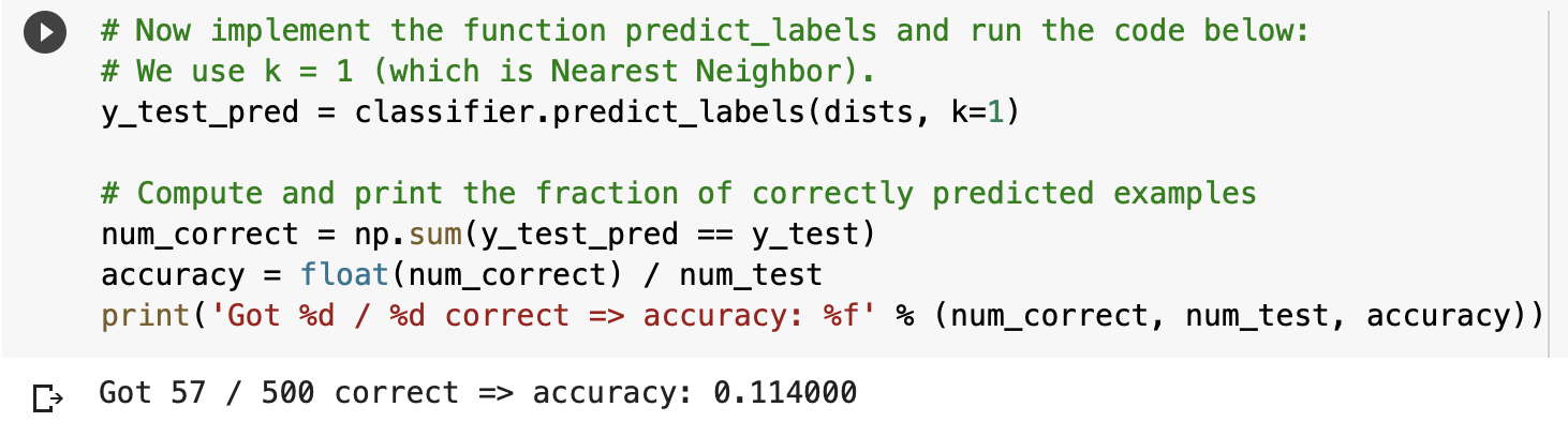 First, I made a mistake by saving the values of dists in closest_y. Then, of course, accuracy was 0. So I tried printing the values in the ipynb file with