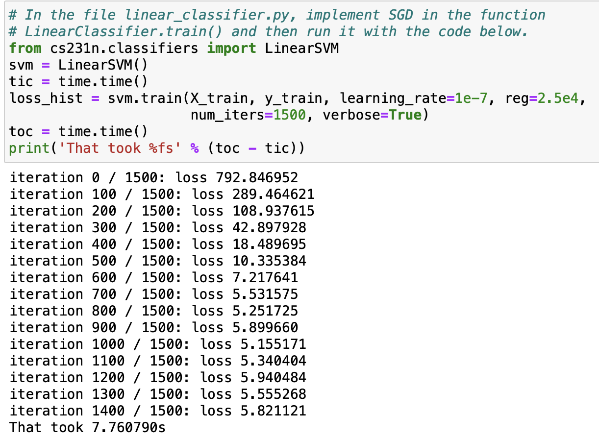 1. def train( self, X, y, learning_rate=1e-3, reg=1e-5, num_iters=100, batch_size=200, verbose=False)