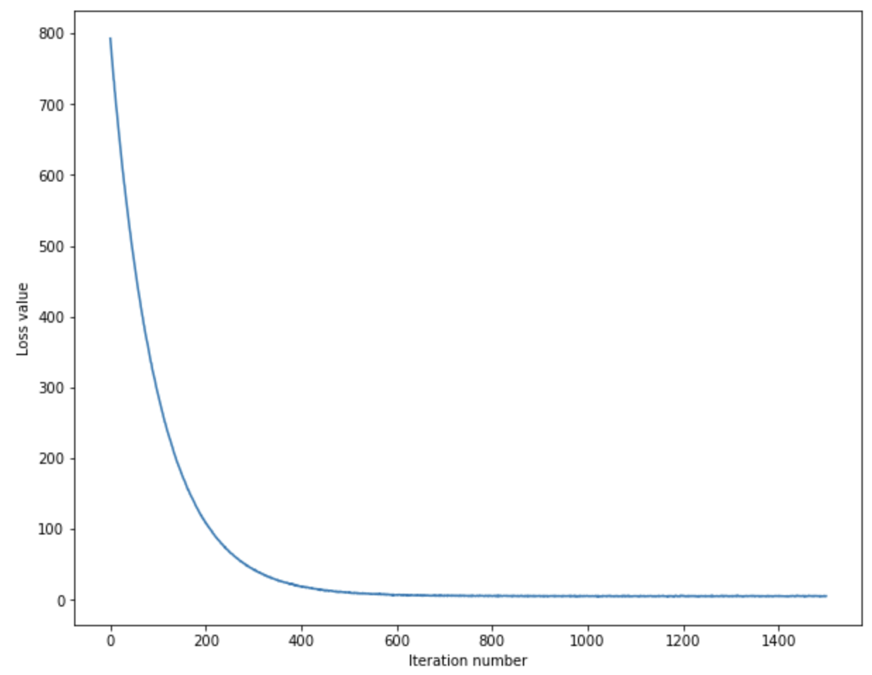 svm.train(X_train, y_train, lr, reg, num_iters=1500, verbose=True)