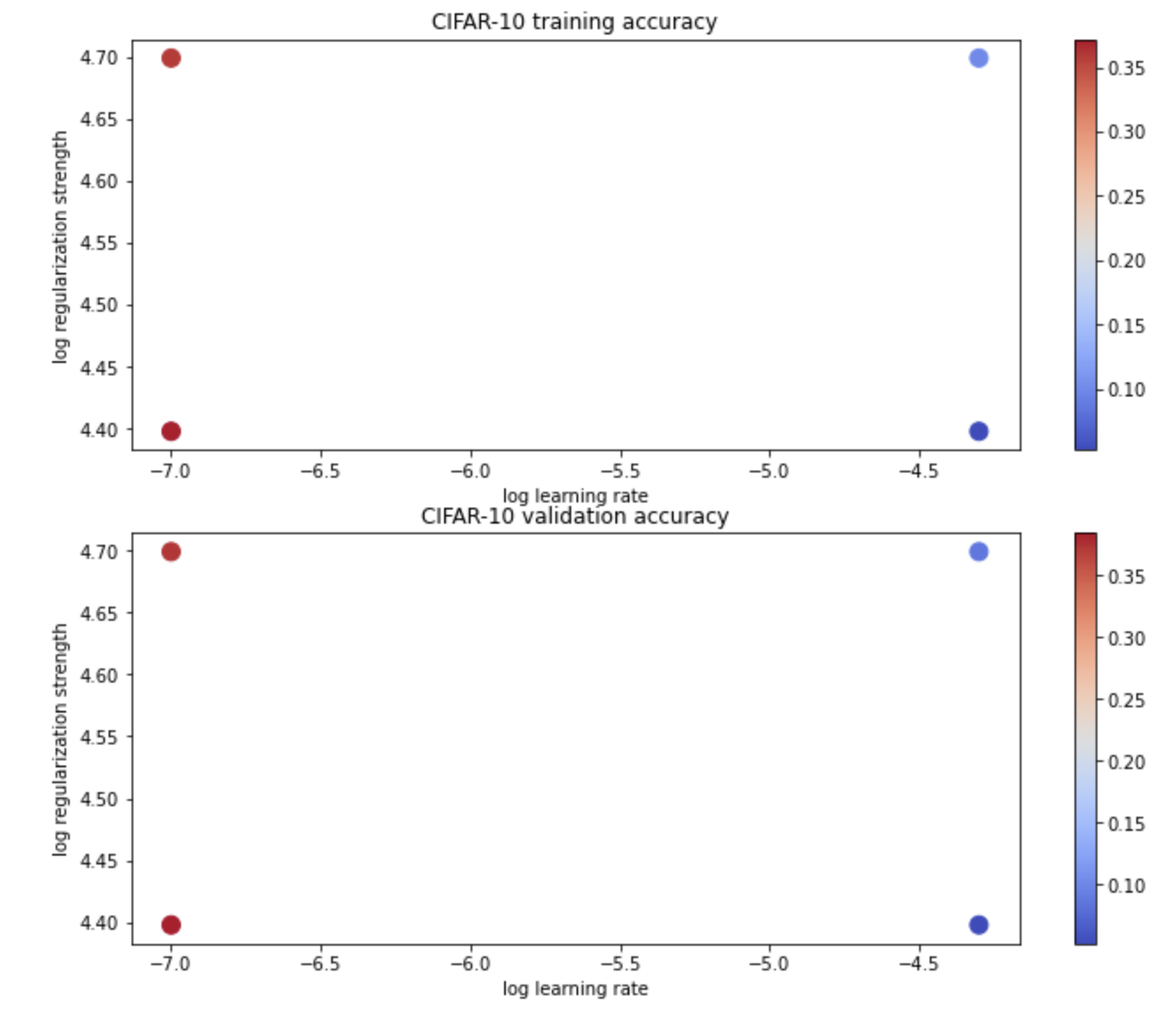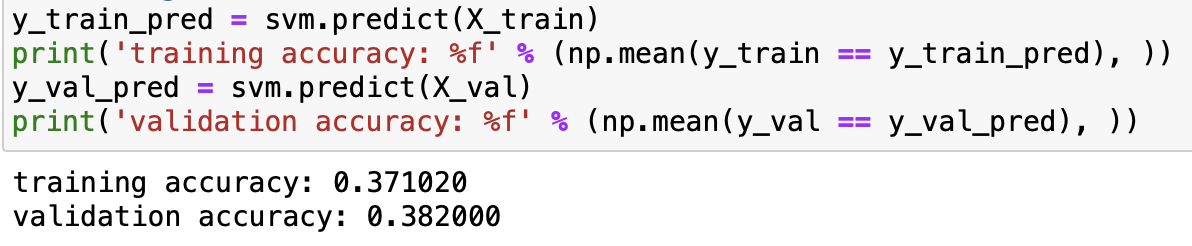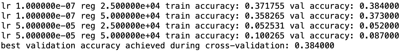 results[(lr, reg)] = np.mean(y_train == y_train_pred), np.mean(y_val == y_val_pred)