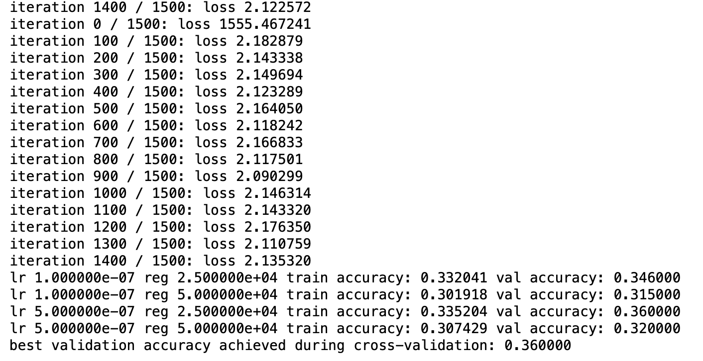 results[(lr, reg)] = np.mean(y_train == y_train_pred), np.mean(y_val == y_val_pred)