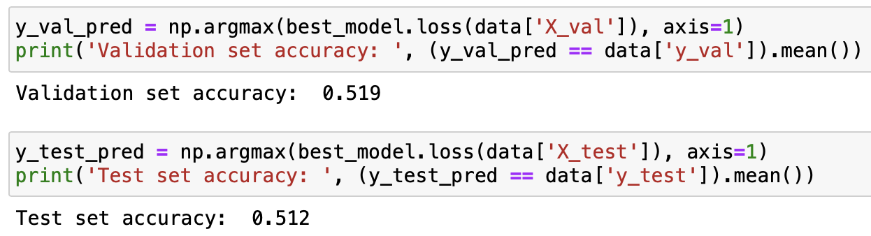 print("with hidden_dims, learning_rates, epochs, reg_strengths = (", hd,", ", lr,",", e,",", rs, " ) accuracy : ",max_score)